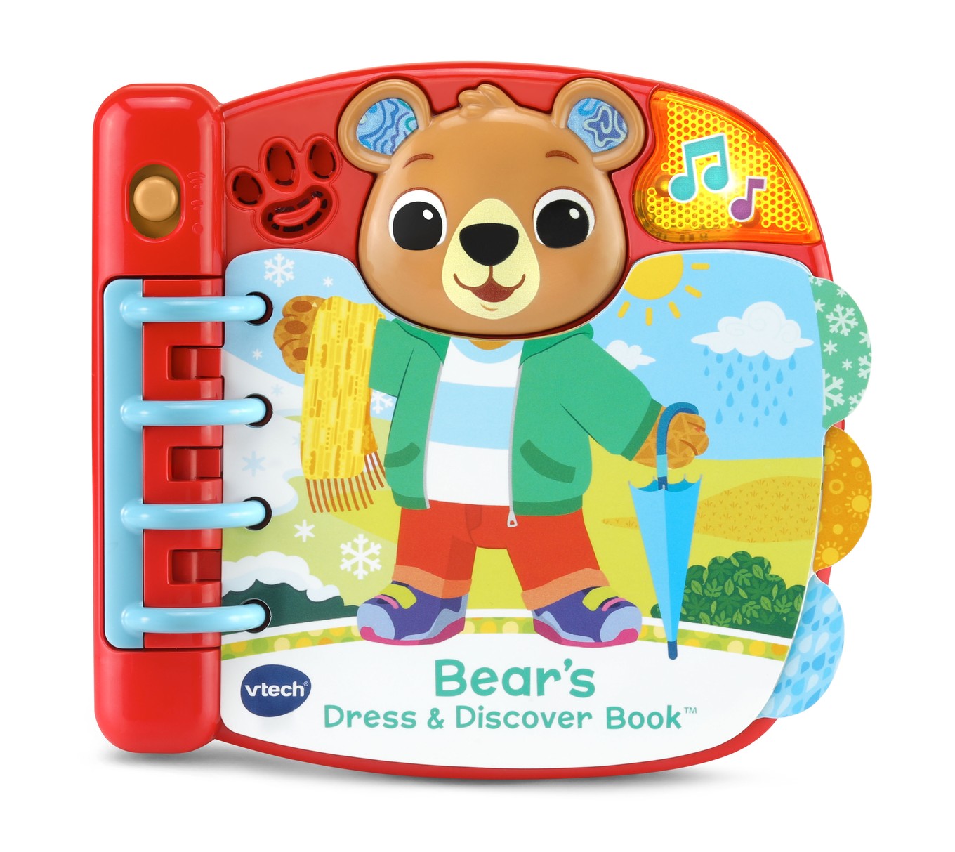 Guide your toddler away from wearing shorts in the snow with the Bear’s Dress & Discover Book™. This interactive book helps your little one understand what to wear for sunny, snowy and rainy weather. See Bear in three weather scenes—with the right clothes for the weather! Three chunky tabs make it easy for your little one to turn the pages. Here is Bear on a snowy day, wearing everything needed to stay warm. A sunny day at the beach is the right weather for Bear to wear shorts and a T-shirt. Next, find Bear on a rainy day, happily wearing a raincoat and boots. The bear button encourages little hands to press and explore with 50 songs, melodies and phrases about weather and clothing. Intended for ages 12-36 months. Requires 2 AAA batteries. Batteries included for demo purposes only. New batteries recommended for regular use.
