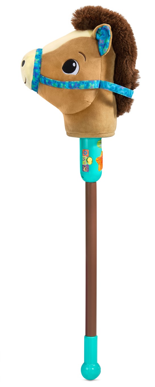 Hop in the saddle of this adorable hobby horse, then ride and dance to the music or discover facts about the friendly horse in two modes Ride around to play music and change the tempo of the tunes by riding fast or slow for exciting cause and effect play This pony is chomping at the bit to play, so press the light-up star to hear from the horse and change the music The horse’s head easily connects to the riding stick with a click for a 30-inch-long hobby horse Intended for ages 3-6 years; requires 2 AAA batteries; batteries included for demo purposes only; new batteries recommended for regular use This hobby horse toy is great for preschoolers to explore cause and effect and pretend play; makes a cute unisex gift for holidays, birthdays, school rewards or just because