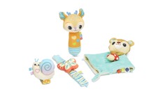 Cuddle up to the three-in-one soft fawn, lovey blanket and pacifier holder with the 3-in-1 Snuggle & Cuddle Lovey™. With soothing nature sounds and music, this snuggly woodland creature brings comfort to your baby. Unfold the fawn to create a little lovey blanket with an attachment for the included leaf teething toy or a pacifier (not included). As babies reach for the teether toy and bring it to their mouths, they practice fine motor skills and hand-eye coordination. The soft plush, embroidered features and textured teething leaf stimulate your baby’s senses. Soft lights and sounds help your baby learn to self-soothe with this cuddly companion. Includes 35+ songs, sounds, phrases and melodies. Machine washable with removable electronic module. Intended for ages Birth+. Requires 3 LR44 batteries. Batteries included for demo purposes only. New batteries recommended for regular use.